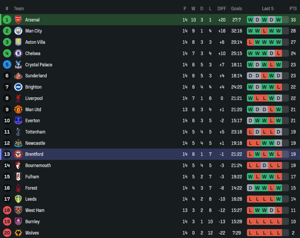- ยิงทั้งหมด: อาร์เซนอล 15 ครั้ง – เบรนท์ฟอร์ด 6 ครั้ง