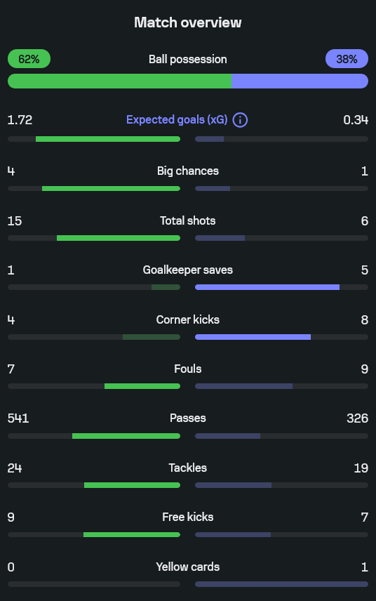 - ผ่านบอล: อาร์เซนอล 541 ครั้ง – เบรนท์ฟอร์ด 326 ครั้ง