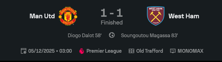 ศึกพรีเมียร์ลีก 2025/26 ที่โอลด์ แทรฟฟอร์ดจบลงด้วยผล แมนเชสเตอร์ ยูไนเต็ด เสมอ เวสต์แฮม ยูไนเต็ด 1-1 ผลงานในหน้าเว็บ ผลบอลสด ดูสวยตรงสถิติ แต่ในสนามแฟนผีมีหัวร้อนกันทั้งแถว เพราะยิงนำแล้วดันปล่อยสามแต้มหลุดมือแบบชวนกุมขมับ 😅