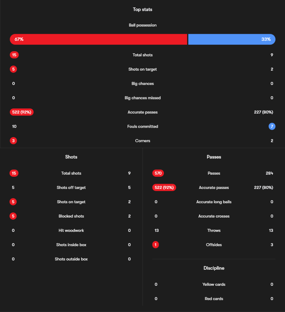 แดนกลางที่มีทั้งบรูโน่กับกาเซมิโร่คุมเกมถือว่าโอเค สลับไปยืนสูงต่ำกันดี แต่พอถึงพื้นที่สุดท้ายจังหวะสุดท้ายเหมือนทุกคนอยากเป็นฮีโร่เอง บอลเลยขาด ๆ เกิน ๆ ไปหมด ขณะที่แนวรับก็ยังมีช่วงเหม่อให้เห็น โดยเฉพาะช็อตโดนมกาแซซ่าตีเสมอที่ปล่อยให้ขึ้นโหม่ง/ยิงแบบไม่ถูกรบกวนมากพอ