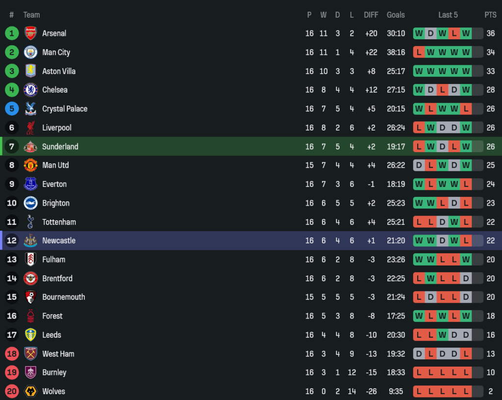 - สถานการณ์บนตาราง: ซันเดอร์แลนด์กระโดดขึ้นอันดับ 7 มี 26 แต้ม ลุ้นพื้นที่ยุโรปยาวๆ ส่วนนิวคาสเซิ่ลหล่นไปอยู่โซนกลางตารางอันดับ 12 มี 22 แต้ม ฟอร์มแกว่งจนแฟนเริ่มห่วง