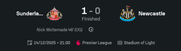 ดาร์บี้แมตช์ พรีเมียร์ลีก ที่สนาม Stadium of Light จบแบบช็อกแฟนทีมเยือน เมื่อซันเดอร์แลนด์เปิดบ้านอัดนิวคาสเซิ่ล 1-0 จาก นิค โวลท์มาเด้ กองหน้าสาลิกา…ยิงเข้าประตูตัวเองตั้งแต่ต้นครึ่งหลัง นาที 46 กลายเป็นประตูโทนของเกมนี้ ส่งผลให้ “แมวดำ” เก็บสามแต้มสุดสำคัญ ขยับเกาะกลุ่มบนตาราง ขณะที่ “สาลิกาดง” ได้แต่มองจอ ผลบอลสด แล้วถอนหายใจยาว
