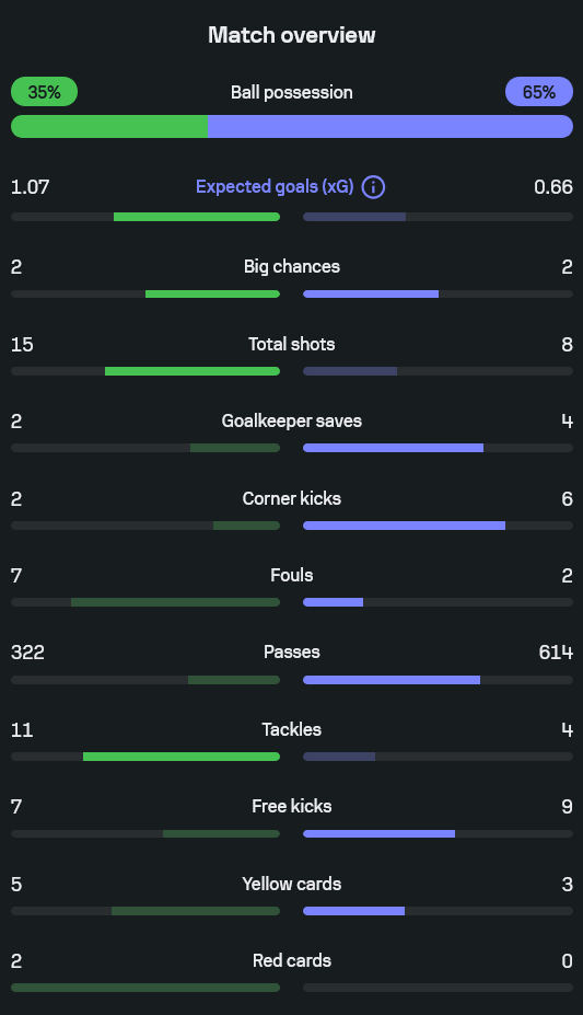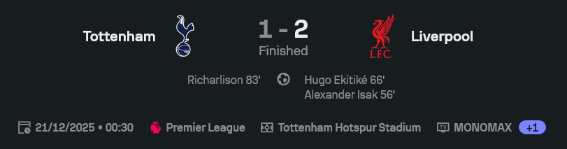 สเปอร์สของโธมัส แฟรงก์พยายามเล่นเร็วสวนกลับ ใช้คูลูเซฟสกี้, ซิมอนส์, คอโล มูอานี กับริชาร์ลิซอน ลากทะลุแนวรับหงส์ แต่พอโดนใบแดง เกมรับต้องถอยลึก พอเสียสมดุลกลางสนาม กลายเป็นวิ่งไล่เงาบอลทั้งครึ่งหลัง แม้จะมีช่วงท้ายที่ริชาร์ลิซอนยิงปลุกทีมได้ แต่เวลาน้อยเกินจะกู้แต้ม