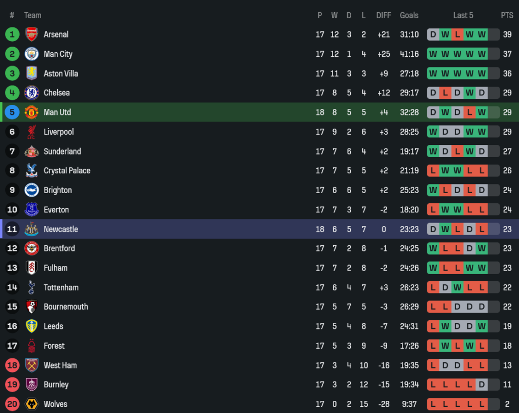 - แมนฯ ยูไนเต็ด ขยับยึดที่ 5 มี 29 แต้ม ส่วน นิวคาสเซิ่ล หล่นมามองตารางโซนกลางแบบเซ็ง ๆ ที่ 11