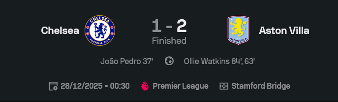 เกมนี้ในศึก พรีเมียร์ลีก ที่สแตมฟอร์ด บริดจ์ เชลซีครองบอลเยอะ หล่อๆ แบบสถิติสวยบนกระดาน แต่พอเปิดดูจบ 90 นาที สกอร์บนจอ ผลบอลสด กลับเขียนชัดๆ ว่าเจ้าบ้านแพ้ แอสตัน วิลล่า 1-2 จากสองดอกคมๆ ของ โอลลี่ วัตคินส์ ส่วนสิงห์บลูส์ได้ประตูนำก่อนจาก เจา เปโดร ทว่าดันปิดบัญชีไม่ได้ สุดท้ายโดนสิงห์ผงาดหักปากกาเซียนเหมือนเดิม