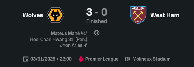 เกมนี้ที่โมลินิวซ์เหมือนวูล์ฟส์ตั้งใจจะเขียนสกอร์ใหม่ให้แฟนเช็ก ผลบอลสด กันรัว ๆ เจ้าถิ่นปล่อยให้เวสต์แฮมถือบอลไปเถอะ แต่เวลาแทงเขี้ยวแต่ละทีคือจบคมโหดจัด สุดท้ายจบด้วยชัยชนะ 3-0 แบบไม่เถียง