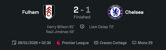 ฟูแล่มของมาร์โก ซิลวา เล่นกันแบบบอลทีมชัดเจน 3-4-2-1 วางฮิเมเนซยืนหน้าเป้า วิลสันกับสมิธ โรว์หุบเข้ากลาง เวลาบุกกลายเป็น 3-2-5 กดดันแผงหลังเชลซีจนหลุดตำแหน่งตลอด พอทีมเยือนเหลือสิบคน เกมริมเส้นของสิงห์แทบหายไป เหลือแค่เลียม เดลัป ที่วิ่งสู้ชีวิตจนได้ประตูตีเสมอ แต่สุดท้ายความนิ่งในพื้นที่สุดท้าย ฟูแล่มทำได้ดีกว่า ยิงน้อยกว่า xG แต่งานละเอียดคมกว่า ส่งสิงห์กลับบ้านมือเปล่าแบบเจ็บ ๆ