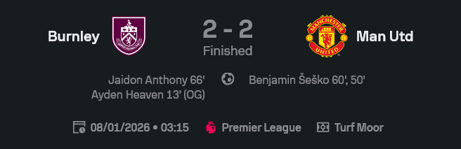 เกมที่เทิร์ฟ มัวร์คืนนี้ แฟนผีดูหน้าเครียดกันทั้งแถบ เพราะแมนเชสเตอร์ ยูไนเต็ดครองบอลแทบทั้งสนาม แต่สุดท้ายต้องยอมแบ่งแต้มกับเบิร์นลี่ย์ 2-2 ในศึกพรีเมียร์ลีก 2025/26 ทั้งที่เบนจามิน เซสโก้กดคนเดียวสองเม็ดเหมือนจะปิดจ๊อบเรียบร้อยแล้วด้วย ฟอร์มตามตัวเลขในหน้า ผลบอลสด หล่อไม่สุด เพราะผีปล่อยให้เจ้าถิ่นฮึดกลับมาซัดตีเสมอแบบเจ็บ ๆ คัน ๆ