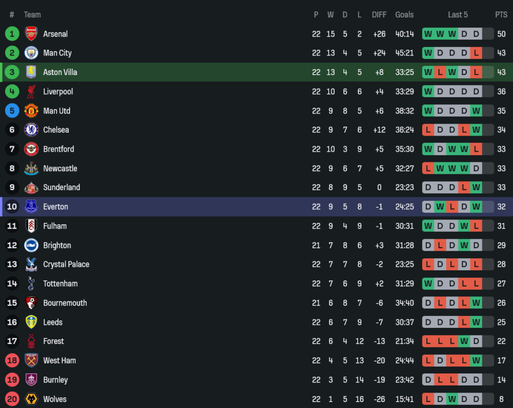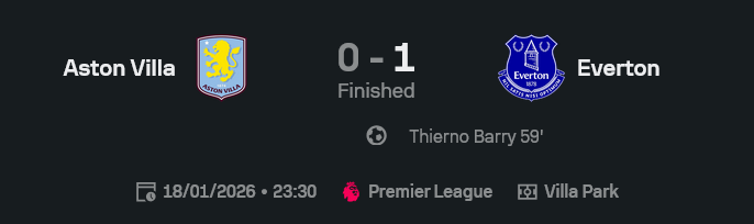 ตัวแปรจริงๆ อยู่ที่ พิคฟอร์ด เซฟเนียนหลายลูกจนเกมรุกวิลล่าเริ่มเกร็ง ขณะที่แนวรับท็อฟฟี่อย่าง ทาร์คอฟสกี้ กับ โอไบรอัน จัดการลูกกลางอากาศของวัตกิ้นส์ได้ดี ทำให้วิลล่าหมดมุกช่วงท้าย ผลคือสามแต้มสำคัญที่ทำให้เอฟเวอร์ตันขยับขึ้นกลางตาราง ส่วนวิลล่าพลาดโอกาสไล่จี้สองทีมนำในโซนหัวตารางแบบน่าเสียดาย