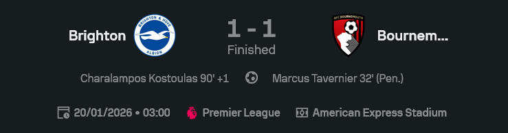 เกมนี้ที่เอเม็กซ์ สเตเดียม ไบรท์ตันครองบอลบี้บอร์นมัธทั้งคืน แต่ดันโดนนำก่อนจากจุดโทษของมาร์คัส ทาเวอร์เนียร์ ก่อนที่ชาราลัมปอส คอสตูลาส จะสวมบทฮีโร่ซัดตีเสมอช่วงทดเจ็บ นาที 90+1 เปลี่ยนหน้าไทม์ไลน์จากโหมดหัวร้อนเป็นโหมดระบายโล่งให้แฟนนกนางนวลแบบช็อตเดียวจบ ใครเปิดดูทันท้ายเกมนี่บอกเลยโคตรคุ้มสเตตัสสายเช็ก ผลบอลสด