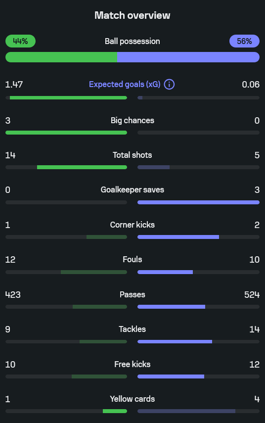 • ค่า xG: เจ้าบ้าน 1.47 ทีมเยือน 0.06 แปลว่าแทบไม่มีจังหวะลุ้นประตูเป็นชิ้นเป็นอัน