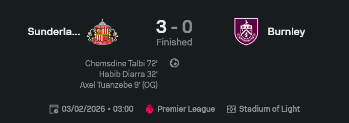 เบิร์นลีย์พยายามเล่นจากหลังขึ้นหน้า แต่จังหวะสุดท้ายช้าไปหนึ่งจังหวะตลอด แถมดันมาเสียประตูตัวเองตั้งแต่ต้นเกม เหมือนโดนกระชากกำลังใจหลุดทั้งทีม ขณะที่เจ้าบ้านยิ่งเล่นยิ่งมั่นใจ เกมรับแน่น เกมรุกคม แถมมีนักเตะแบบดิยาร์ร่า ที่วิ่งไม่มีหมด คอยเชื่อมเกม–ปิดเกมได้หมดจด