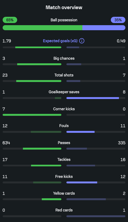 - ค่าความคม xG ผีแดง 1.79 สเปอร์ส 0.49 สะท้อนว่าบุกเยอะและบุกมีคุณภาพกว่า