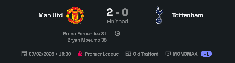 เกมนี้ที่โอลด์ แทร็ฟฟอร์ด แฟนผีได้เฮกันสนั่น สนามแทบแตก แมนเชสเตอร์ ยูไนเต็ด เปิดบ้านอัด ท็อตแน่ม ฮ็อตสเปอร์ 2-0 ในศึกพรีเมียร์ลีก อังกฤษ 2025/26 เกมที่รูปเกมขี่ม้าขาวทั้งค่ำ แถมเมื่อเช็กจาก ผลบอลสด แล้วบอกเลยว่าคู่แข่งแทบไม่ได้หายใจตั้งแต่โดนใบแดง