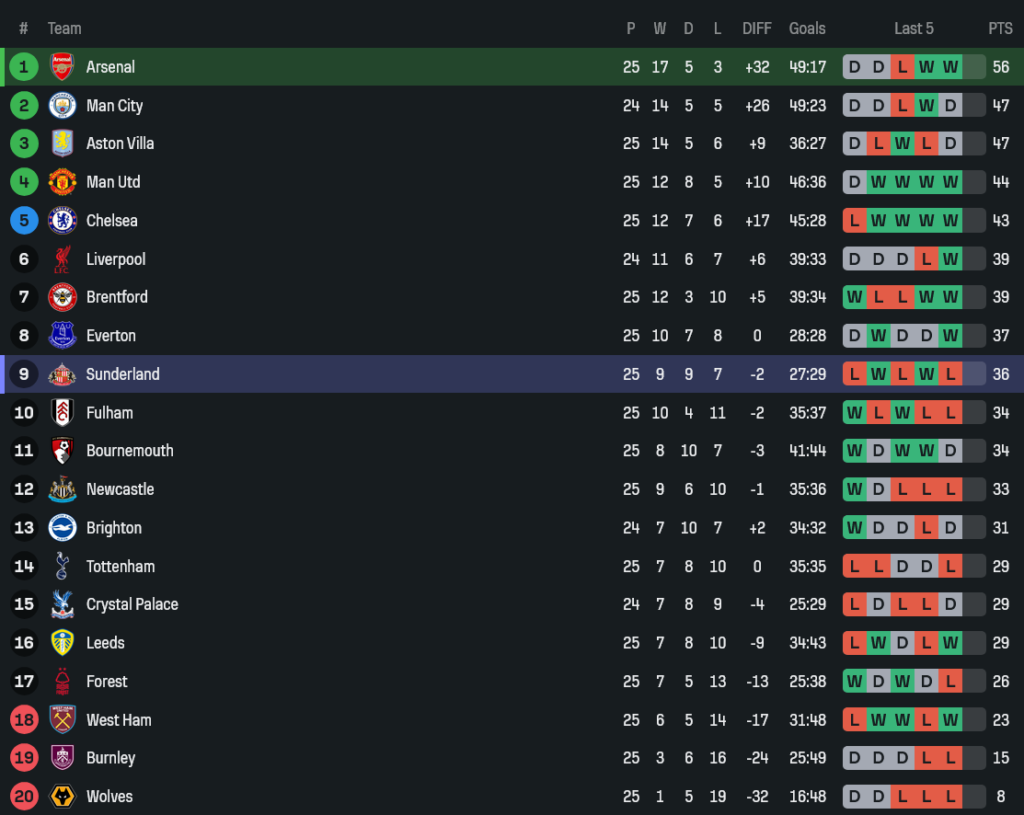 - การครองบอล: อาร์เซนอล 49% – ซันเดอร์แลนด์ 51% (แต่คุณภาพเกมรุกไม่ใกล้กัน)