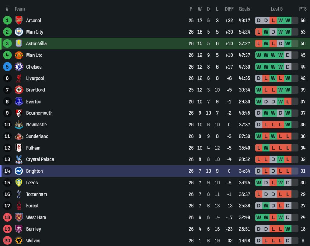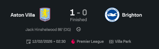 ฝั่งไบรท์ตันรูปเกมไม่ได้แย่ มิโตมะยังเป็นตัวป่วนเหมือนเดิม เพียงแต่จังหวะสุดท้ายวันนี้ไม่เป็นใจ แถมดันมาเสียลูกโอจีของฮินเชลวูดเองอีก นี่แหละบอลลีกสูงสุด พลาดนิดเดียวโดนลงโทษทันที ผลนี้ทำให้วิลล่าลุ้นท็อปโฟร์ต่อเนื่อง ส่วนไบรท์ตันต้องรีบเคลียร์สมอง เพราะฟอร์มช่วงหลังแพ้บ่อยเกินกว่าที่แฟนจะยิ้มออก