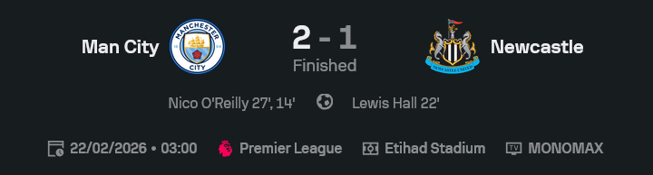 เกมนี้มันคือซิตี้เวอร์ชัน “บุกเยอะแต่ก็ยังลุ้นเสียวท้ายเกม” ครองบอลเหนือกว่า สร้างโอกาสชัดกว่า แต่ความคมมันไม่ได้มาเป็นแพ็กคู่กับความชัวร์เสมอไป นิวคาสเซิลมีช่วงที่โต้กลับแล้วน่ากลัว โดยเฉพาะครึ่งหลังที่เปลี่ยนตัวเติมเกมรุกจนเจ้าถิ่นเริ่มออกอาการล้า แต่สุดท้ายความต่างคือ ซิตี้มีคนที่ “จบให้” ได้จริง และวันนี้ชื่อมันคือ โอไรลีย์ ไม่ใช่คนที่แฟนคิดไว้ตอนก่อนเตะด้วยซ้ำ ชนะนัดนี้ยังสำคัญต่อภาพรวมตารางด้วย เพราะซิตี้เก็บเพิ่มไล่จี้จ่าฝูงเหลือห่างแค่ 2 แต้ม ยังมีลุ้นยาวๆแบบไม่ต้องพูดเยอะ