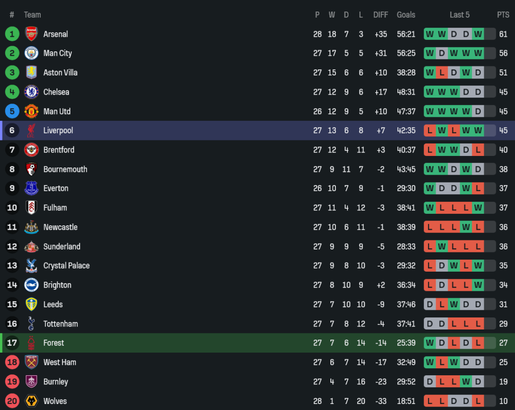 • ยิงทั้งหมด: ฟอเรสต์ 18 – ลิเวอร์พูล 10