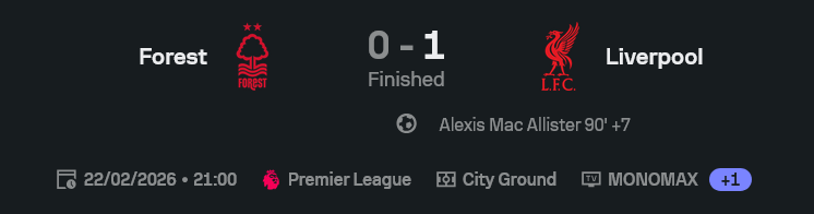 • ใบเหลือง: ฟอเรสต์ 2 – ลิเวอร์พูล 0