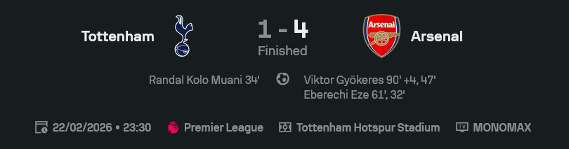 ลอนดอนดาร์บี้ที่ควรจะเดือดแบบสูสี…แต่สุดท้ายกลายเป็นคืนที่อาร์เซนอล “คุมเกมแล้วคุมใจ” ไปด้วย จบ 90 นาที สเปอร์สโดนจัดหนัก 1-4 ในศึกพรีเมียร์ลีก อังกฤษ 2025/26 เกมนี้ภาพมันชัดเลยว่า เจ้าบ้านพยายามสู้ แต่เกมรับหลุดเป็นช่วงๆ เจอทีมที่จังหวะสุดท้ายโหดกว่า ก็มีสิทธิ์โดนสอนบอลแบบไม่ต้องตั้งแถวขอโทษ