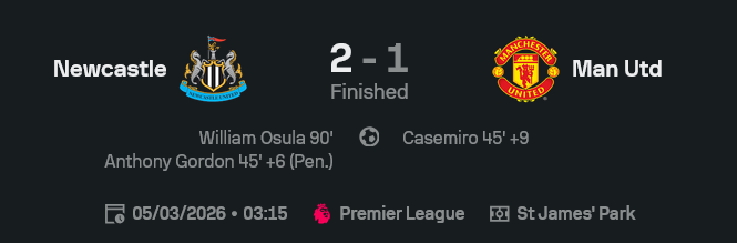 ฝั่งนิวคาสเซิลนี่ชัดเจนกว่า ทำเกมไม่ต้องเยอะ แต่เลือกจังหวะเอาให้ตาย ทั้งจุดโทษที่กอร์ดอนนิ่งจัด และการสวนกลับนาที 90 ที่แทงเข้าเส้นเลือดแฟนผีแบบไม่ขออนุญาตด้วยซ้ำ กอร์ดอนเป็นคนคุมอารมณ์เกมได้ดีสุด แล้วได้ตำแหน่งผู้เล่นยอดเยี่ยมก็ไม่แปลก