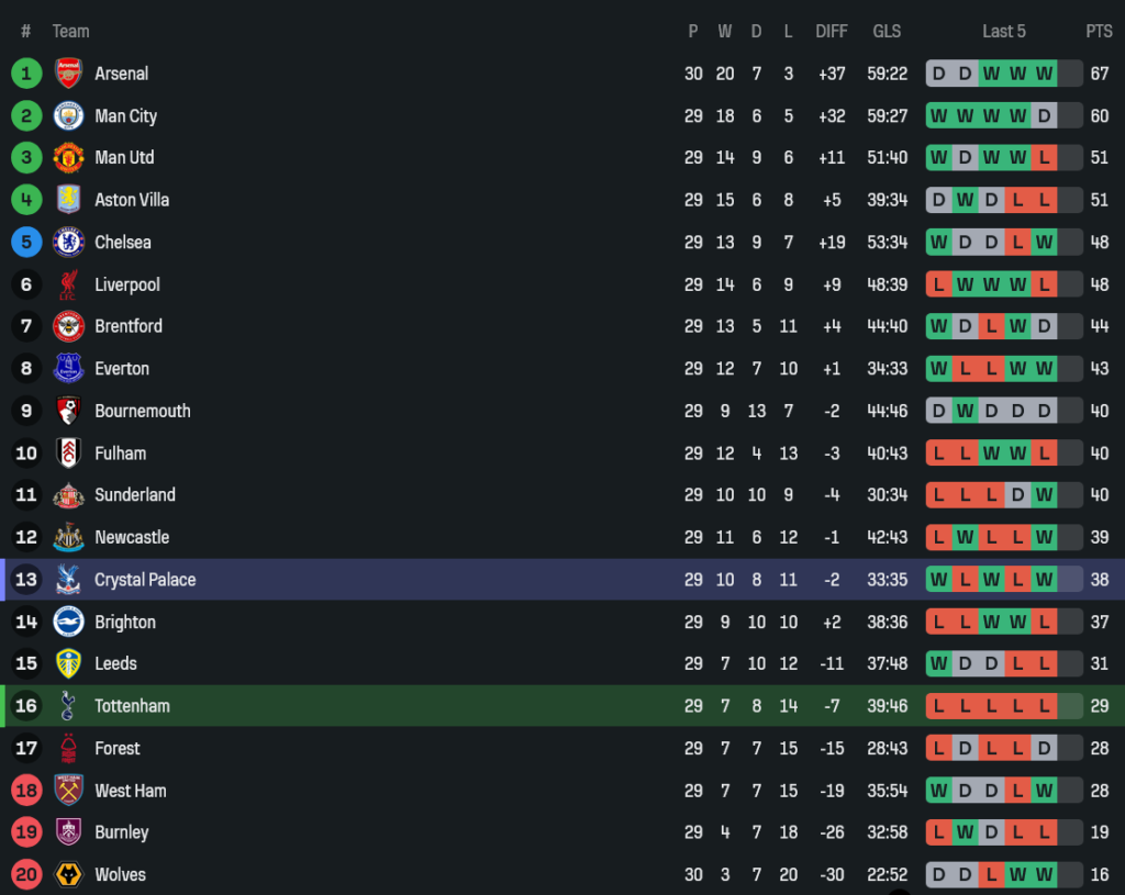 - หลังเกม สเปอร์สยังจมอันดับ 16 มี 29 แต้ม ส่วนพาเลซขยับเป็นอันดับ 13 มี 38 แต้ม