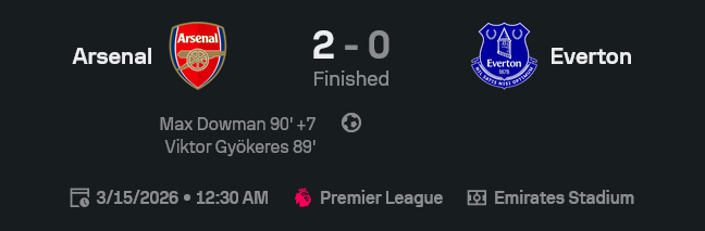 เกมนี้ พรีเมียร์ลีก อังกฤษ 2025/26 อาร์เซนอลครองเกมได้มากกว่าแทบตลอด แต่กว่าจะเจาะเอฟเวอร์ตันเข้าเล่นเอาแฟนเจ้าถิ่นหงุดหงิดไม่น้อย สุดท้ายพอถึงช่วงเวลาสำคัญ ปืนใหญ่ก็ปล่อยของจริง ยิงสองเม็ดรวดจาก วิคตอร์ โยเคเรส นาที 89 และ แม็กซ์ ดาวแมน นาที 90+7 เก็บ ผลบอลสด 2-0 แบบคนดูเหนื่อยก่อนเฮ