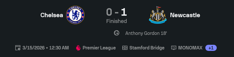 ผลบอลสด พรีเมียร์ลีก อังกฤษ เกมนี้เชลซีเป็นฝ่ายเดินหน้าใส่แทบทั้งเกม ครองบอลเยอะ ยิงเยอะ แต่จบไม่คม สุดท้ายโดน แอนโธนี กอร์ดอน ซัดให้ นิวคาสเซิ่ล นำตั้งแต่นาที 18 ก่อนทีมเยือนจะตั้งรับแน่น เก็บสามแต้มกลับบ้านแบบเจ็บๆ สำหรับเจ้าถิ่น