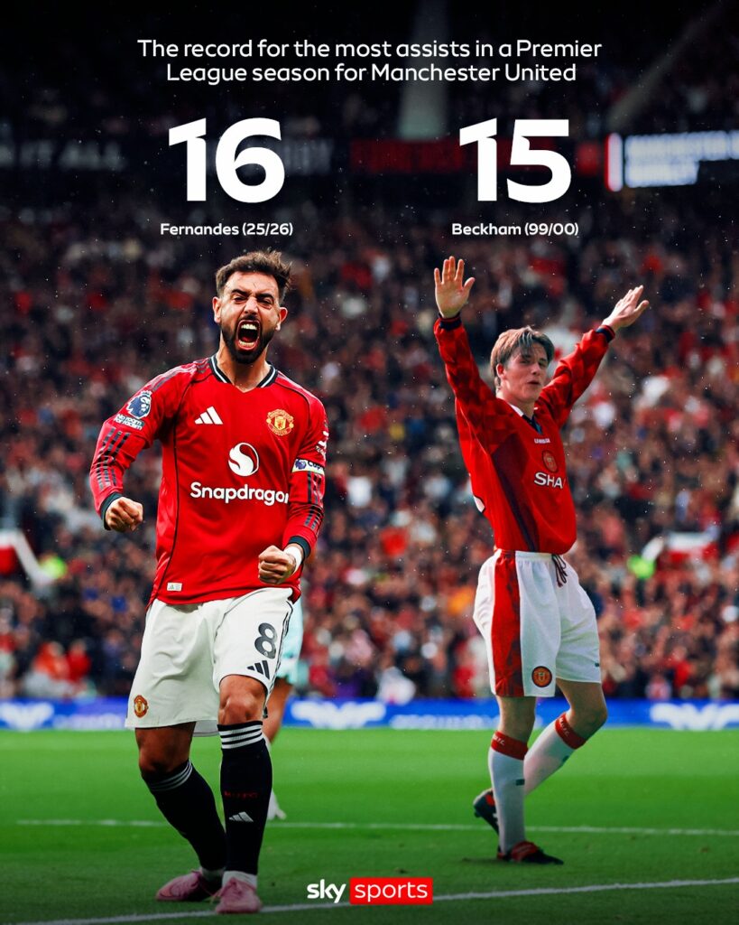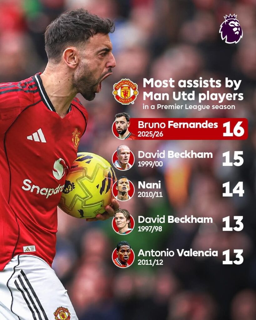 บรูโน่ แฟร์นันด์ส กัปตันแมนเชสเตอร์ ยูไนเต็ด ทำ 2 แอสซิสต์เกมชนะ แอสตัน วิลล่า 3-1 ส่งผลให้ยอดแอสซิสต์ในพรีเมียร์ลีกฤดูกาล 2025/26 พุ่งเป็น 16 ครั้ง สร้างสถิติใหม่แอสซิสต์มากสุดของ “ผีแดง” ต่อซีซั่นแซงสถิติเดิมของ เดวิด เบ็คแฮม ที่เคยทำไว้ 15 ครั้งในหนึ่งซีซั่น