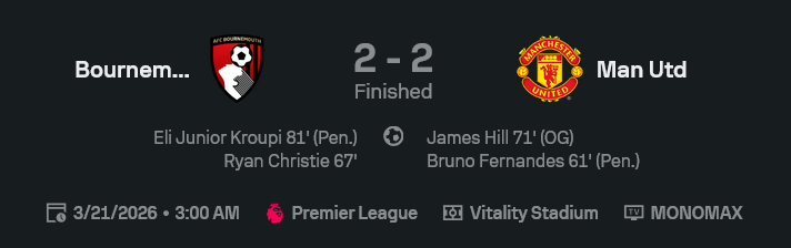 เกมนี้คือแมนยูในเวอร์ชันเดิม ๆ นำได้แต่คุมไม่อยู่ พอเกมเริ่มเข้าทางก็ชอบเปิดช่องให้เรื่องวุ่นเข้ามาเยี่ยมเสมอ ฝั่งบอร์นมัธอาจไม่ได้เหนือกว่าทุกด้าน แต่เล่นด้วยความดื้อและความกล้า จนสมควรมีแต้มติดมือ ถ้ามองในมุม วิเคราะห์บอล แบบตรงไปตรงมา ผลเสมอนี้เจ้าบ้านยิ้มได้มากกว่า ส่วนแมนยูคงได้แต่นั่งบ่นว่าทำสามแต้มหลุดมือกันเองอีกแล้ว