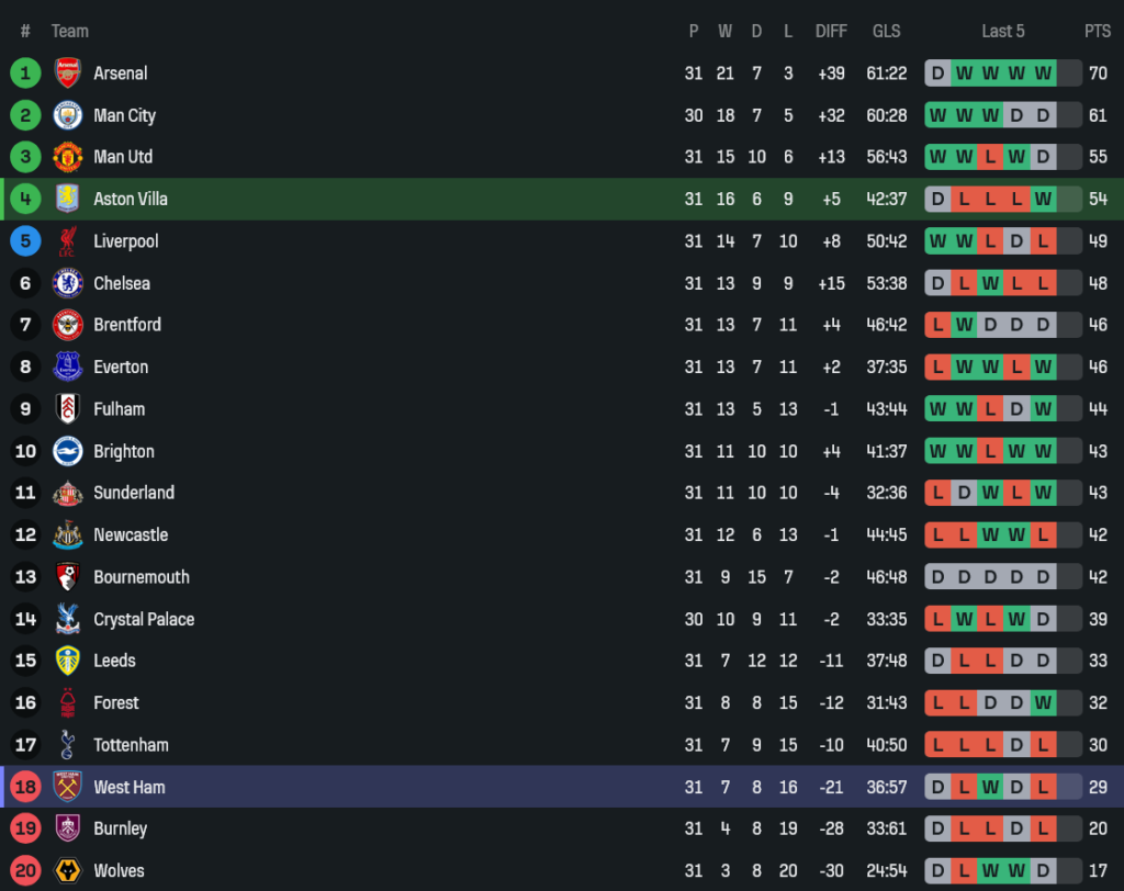 - วิลล่าขยับไปมี 54 แต้ม รั้งอันดับ 4 ต่อ ส่วนเวสต์แฮมยังอยู่ที่ 18 มี 29 แต้ม