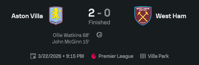 ศึกพรีเมียร์ลีก อังกฤษ คู่นี้ ผลบอลสด ชัดเจนตั้งแต่รูปเกม แอสตัน วิลล่า เปิดบ้านอัด เวสต์แฮม 2-0 แบบคุมจังหวะได้เหนือกว่า บุกมีพิษมีภัยกว่า และลงโทษคู่แข่งได้ตรงเวลา ส่วนทีมเยือนมีช่วงพอได้ลุ้น แต่จังหวะสุดท้ายยังไม่เฉียบพอจะเปลี่ยนเกม