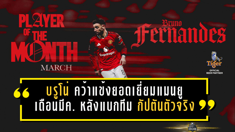 บรูโน่ แฟร์นันด์ส กัปตันทีมแมนเชสเตอร์ ยูไนเต็ด คว้ารางวัลนักเตะยอดเยี่ยมประจำเดือนมีนาคมของสโมสร หลังโชว์ฟอร์มโดดเด่นต่อเนื่องและเป็นแกนหลักของทีมอย่างชัดเจนในช่วงสำคัญของฤดูกาล