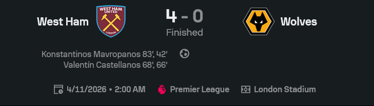 เกมนี้วูล์ฟส์มีบอล แต่ไม่มีเขี้ยว พอขึ้นไปถึงพื้นที่สุดท้ายก็เบาเกินจะทำให้เวสต์แฮมสะเทือน ต่างจากเจ้าบ้านที่เล่นง่ายแต่คม โดยเฉพาะลูกตั้งเตะกับเกมสวนกลับที่เล่นงานทีมเยือนได้ตลอด มาฟโรปานอสเด่นจัดในลูกกลางอากาศ ส่วนคาสเตยานอสก็หาจังหวะจบได้โหดพอสมควร มองในแง่ วิเคราะห์บอล นี่คือเกมที่บอกชัดว่า ความเฉียบคมสำคัญกว่าการครองบอลสวย ๆ เยอะ