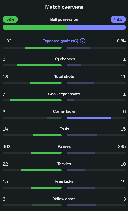 - xG: 1.33 / 0.84