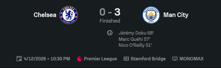 ศึก พรีเมียร์ลีก อังกฤษ คู่นี้จบแบบเจ็บ ๆ สำหรับเจ้าถิ่น เพราะ ผลบอลสด บอกชัดว่า เชลซีโดนแมนเชสเตอร์ ซิตี้บุกอัด 0-3 ทั้งที่ครึ่งแรกยังพอมีจังหวะให้แฟนบอลลุ้น แต่พอครึ่งหลังเปิดมา ซิตี้เร่งเกมใส่แบบไม่ไว้หน้า ก่อนกดสามเม็ดรวดจาก Nico O’Reilly, Marc Guéhi และ Jérémy Doku ปิดงานแบบเด็ดขาด