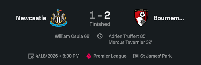 ถ้ามองแบบ วิเคราะห์บอล เกมนี้นิวคาสเซิ่ลไม่ได้แย่ แต่ปัญหาคือจังหวะจบยังไม่คม พอตีเสมอได้แทนที่จะต่อยอด กลับโดนบอร์นมัธลงโทษทันที ทีมเยือนเล่นฉลาดกว่า นิ่งกว่า และเลือกจังหวะเชือดได้คมพอดี