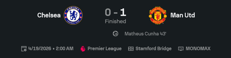 ศึก พรีเมียร์ลีก อังกฤษ คู่นี้จบแบบเชลซีมีสิทธิ์ปวดใจเต็มๆ เพราะดูจาก ผลบอลสด แล้วเจ้าบ้านเป็นฝ่ายกดอยู่แทบทั้งเกม แต่สุดท้ายกลับโดน แมนยูไนเต็ด บุกมาเก็บชัย 1-0 จากประตูเดียวของ มาเตอุส คุนญ่า นาที 43