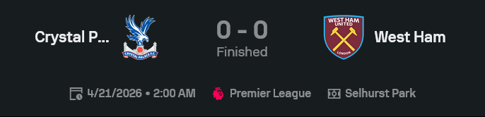- ผ่านบอล พาเลซ 454 ครั้ง เวสต์แฮม 366 ครั้ง