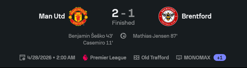 ศึก พรีเมียร์ลีก อังกฤษ ที่โอลด์ แทรฟฟอร์ด จบแบบแฟนผีต้องกำยาดมไว้ข้างตัว แมนยูเปิดบ้านเฉือนเบรนท์ฟอร์ด 2-1 เกมนี้ครึ่งแรกเหมือนจะสบาย ขึ้นนำสองเม็ดจาก คาเซมิโร่ และ เบนจามิน เซสโก้ แต่พอท้ายเกมโดน มาธิอัส เยนเซ่น ยิงไล่มา นาที 87 เท่านั้นแหละ จากบอลคุมเกม กลายเป็นบอลคุมความดันแทนทันที