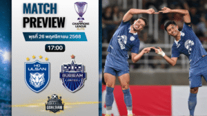 - วิเคราะห์บอล เอเอฟซี แชมเปี้ยนส์ลีก อีลิท : วุลซาน ฮุนได พบกับ บุรีรัมย์ ยูไนเต็ด 26/11/68เจาะลึกก่อนเกมเอเอฟซี แชมเปี้ยนส์ลีก อีลิท วุลซาน ฮุนได เปิดบ้านรับ บุรีรัมย์ ยูไนเต็ด พร้อมสถิติ H2H ฟอร์ม 5 นัดหลัง ขุมกำลังตัวจริง–ตัวสำรอง และทรรศนะเซียนบอลสาย GOALSIAM สำหรับคอบอลที่อยากเช็ก ราคาบอล ก่อนลุ้นมันส์ตลอด 90 นาที